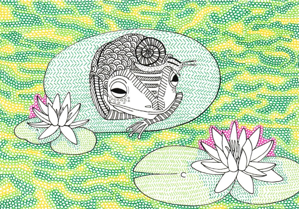Por fin encontraron al Sapo, tumbado en un nenúfar viendo las nubes pasar, con un caracol en la cabeza, no se sabe si como adorno o compañía.